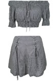 Top: decote ombro a ombro, ajuste em elástico, detalhes em botão e amarração. / Shorts: fecho lateral em zíper, detalhes em amarração, possui bolso.