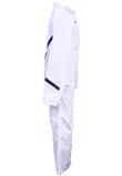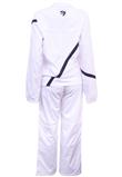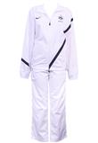 Possui jaqueta e calça de tactel com elásticos nos punhos.