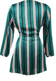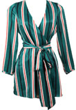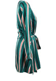 Possui estampa listrada, fecho lateral em zíper com amarração na cintura e decote transpassado.