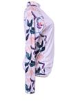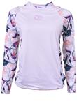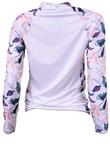 Possui proteção solar e mangas longas estampadas