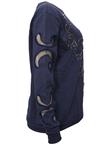 Possui gola redonda, acabamento não flanelado, bordados com pedraria e recortes em tela nas mangas.Ombro: 13cm/ Manga: 62cm/ Busto: 120cm/ Comprimento: 60cm