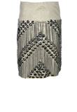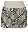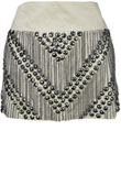 Possui fecho em zíper lateral e aplicações por toda a extensão.