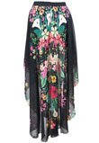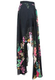 Possui fecho em zíper, forro short, estampa floral e corte assimétrico.