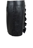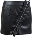 Possui acabamento resinado, fecho em zíper e babados decorativos.