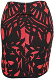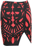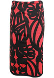 Possui cós elástico, padronagem abstrata e fenda lateral.