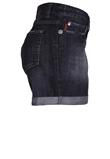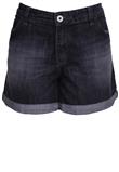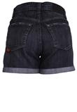 Possui bolsos laterais, traseiros, fechamento por zíper e botão.