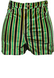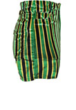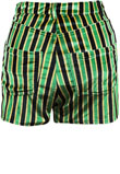 Em veludo, com estampa listrada, possui bolsos, fecho por botão e zíper.
