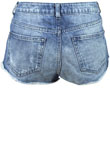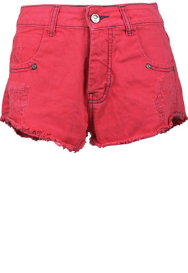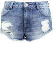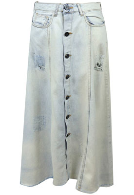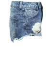 Possui lavagem estonada, acabamento destroyed, bolsos, fecho por botão e zíper.