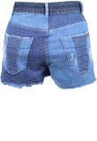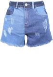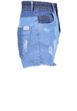 Possui detalhes desfiados, bolsos, fecho por botão e zíper.