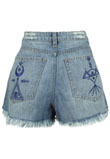Possui acabamento destroyed, bordado posterior e fecho por botões. Cintura: 82cm/ Quadril: 92cm/ Gancho: 30cm/ Comprimento: 32cm