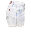 Possui barras desfiadas, bolsos dianteiros e traseiros e fechamento por zíper e botão.