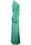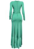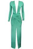 Possui fechamento em zíper, manga longa, decote profundo e fenda.