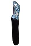 Possui bordado, transparência nas costas, fenda e fechamento em botão.