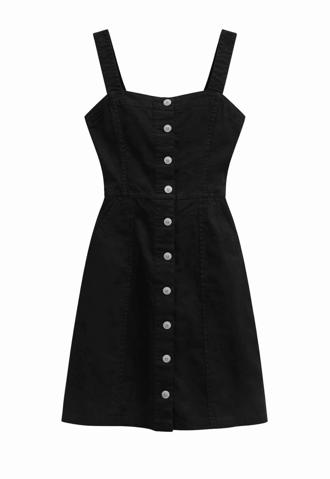 Possui bolsos, alças com regulagem e botões.