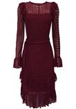 Vestido em renda com babados, possui forro, mangas longas, tira para amarração e fechamento posterior por zíper.Ombro: 4cm/ Manga: 74cm/ Busto: 80cm/ Cintura: 70cm/ Quadril: 84cm/ Comprimento: 114cm
