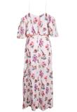 Possui fenda, babados e fechamento por zíper.