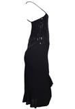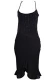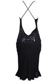 Possui frente única , decote profundo das costas e aplicações de lantejoula.