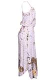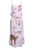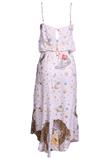 Possui elástico na cintura, ajuste nas alças e fechamento por botão.