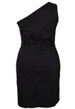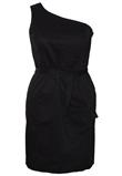 Possui decote um ombro só, fechamento em zíper e fita para amarração.