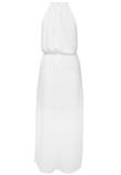 Com decote trapézio e elástico posterior na cintura. Possui detalhes em pregas e fenda lateral. Forrado.