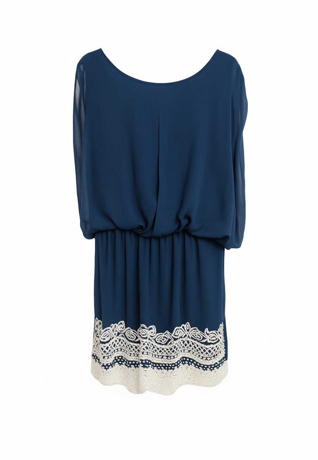 Possui a parte da frente com bordados brancos na saia