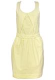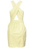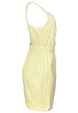 Sem mangas com detalhe aberto nas costas e detalhe na cintura, possui bolsos e fechamento lateral em zíper. Forro interno azul marinho com bolinhas brancas.