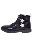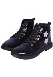 Possui estrelas na lateral, amarração em cadarço e fechamento zíper, modelo tipo sintético,