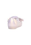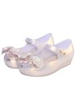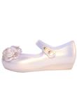 Possui acabamento brilhoso dourado, aplicações de flores e fechamento por velcro.
