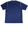 Possui gola redonda e manga curta.