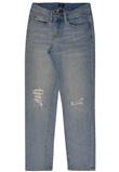 Com detalhes rasgados nas pernas, bolsos dianteiros e traseiros. Fechamento por zíper e botão.