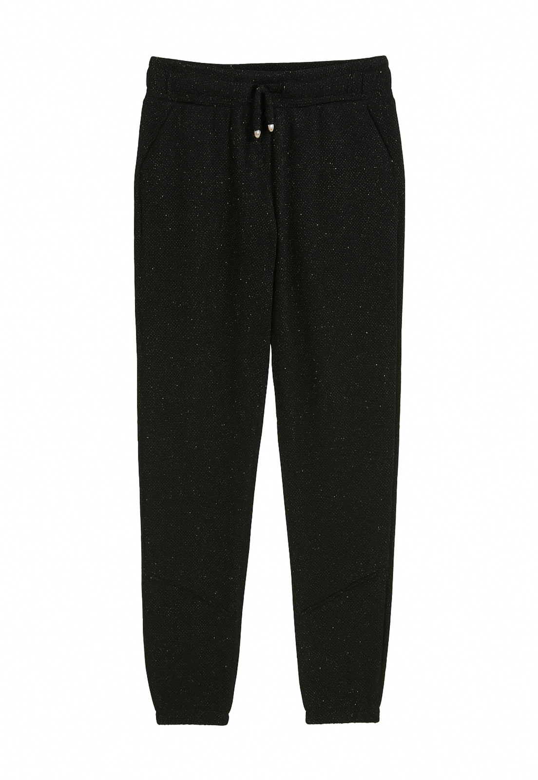 Possui cós elástico, bolsos e detalhe em brilho.