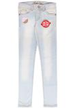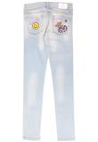 Confeccionada em jeans com elastano, possui aplicação de patches, bolsos dianteiros e traseiros e fechamento por zíper e botão.Cintura: 56cm/ Quadril: 68cm/ Gancho: 17cm/ Comprimento: 86cm