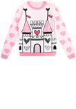 Possui padronagem de castelo com aplicações de hotfix, gola redonda, barra mullet e corações nas mangas. Ombro: 9cm/ Manga: 50cm/ Busto: 72cm/ Comprimento: 52cm