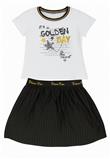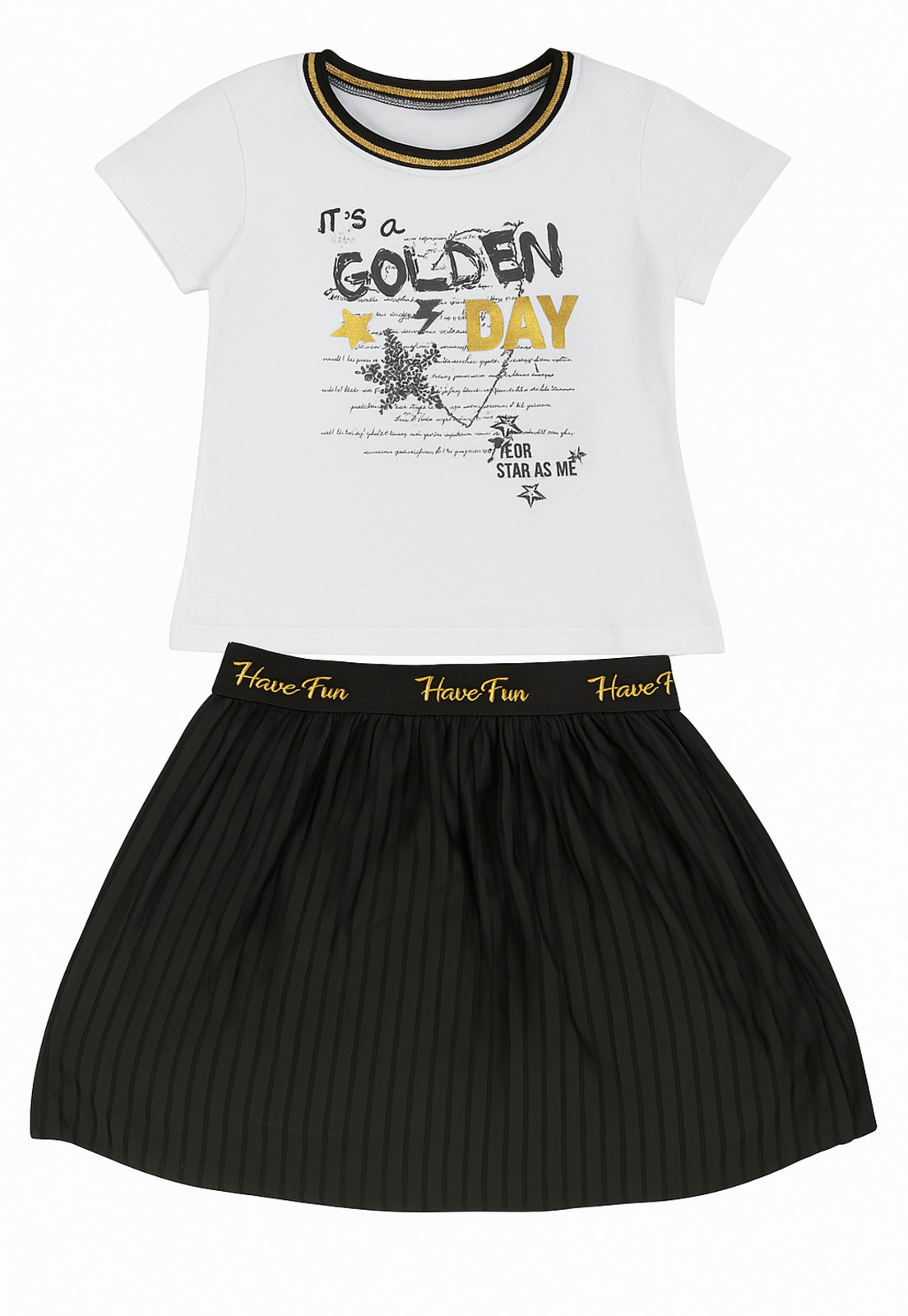 Conjunto composto por blusa e saia. Saia possui cós elástico. Blusa possui detalhe em brilho na gola.