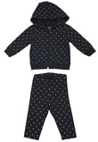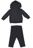 Conjunto composto por jaqueta de moletom não flanelado com fecho em zíper, capuz e bolsos canguru. Legging com cós elástico e estampa de poás.