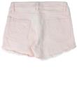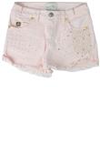 Com aplicação de pérolas e pedras. Jeans com strech, barras desfiadas e bolsos.