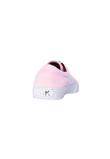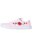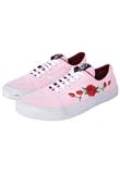 Possui bordado de rosa de fechamento por cadarço. Possui marcas de uso.