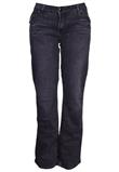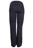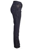 Possui bolsos laterais, traseiros, fechamento por zíper e botão.
